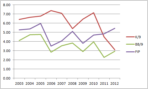 strikeouts, to the point that his FIP is now higher than his strikeout rate. His strikeout rate has dropped rapidly over the past two years,